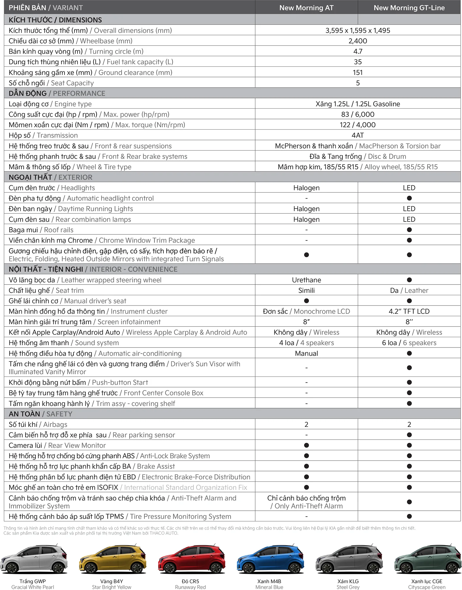 New Morning nổi bật với lưới tản nhiệt mở rộng và mâm xe 15 inch đa chấu mới cá tính cùng cụm đèn LED Starmap đặc trưng thương hiệu. Mẫu xe nhỏ gọn, linh hoạt trong đô thị nhưng vẫn đảm bảo sự thoải mái, khoang lái trực quan và thân thiện, đặc biệt phù hợp với khách hàng nữ. Xe trang bị màn hình giải trí 8” kết nối Apple CarPlay/Android Auto không dây, hệ thống âm thanh 6 loa, điều hòa tự động duy nhất phân khúc và nhiều tiện ích thông minh như khởi động nút bấm, chìa khóa thông minh, cổng sạc đa dạng tùy chọn.