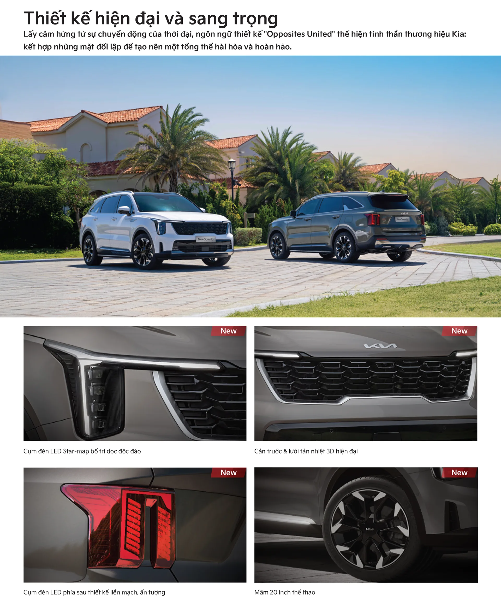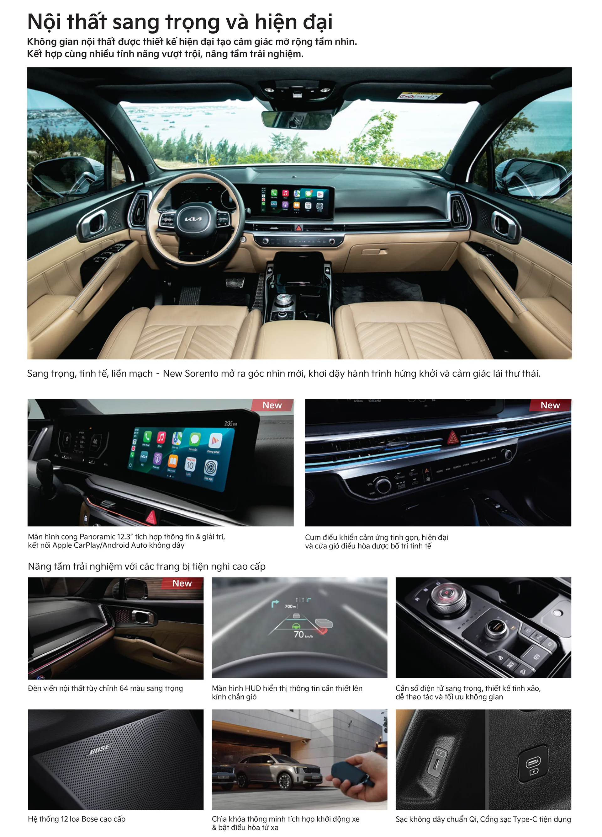 Với nhiều điểm độc đáo từ thiết kế thế hệ mới, tiện nghi đậm chất công nghệ, khả năng vận hành đa dụng cùng hệ thống an toàn cao cấp đạt tiêu chuẩn 5 sao, New Sorento là mẫu xe SUV 7 chỗ thực thụ, sang trọng, là lựa chọn lý tưởng cho khách hàng yêu thích cầm lái tận hưởng sự thoải mái khi cân bằng hoàn hảo giữa sức mạnh, tiện nghi và sự an tâm, đáp ứng trọn vẹn nhu cầu di chuyển trong công việc hàng ngày cũng như các chuyến đi dài ngày cùng gia đình.