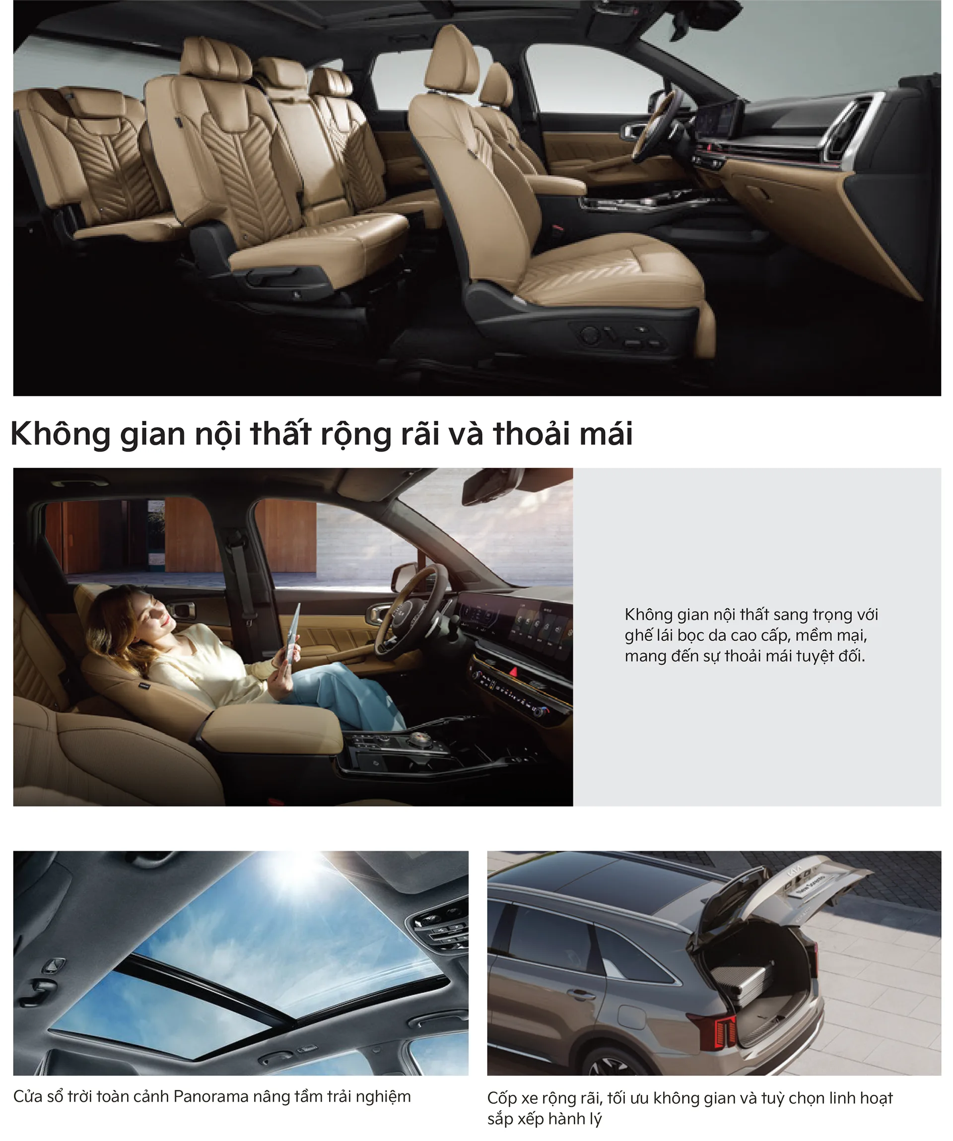 Tiện nghi đậm chất công nghệ với bảng điều khiển nút bấm kết hợp cảm ứng hiện đại, được tích hợp chức năng điều hòa và màn hình trung tâm mang đến sự thuận tiện và hiệu quả khi sử dụng; Cụm màn hình kép Panoramic liền khối kết hợp từ màn hình đa thông tin và màn hình giải trí kích thước 12.3 inch tích hợp kết nối Apple Carplay/Android Auto không dây, hệ thống âm thanh 12 loa Bose cao cấp với hiệu ứng âm thanh vòm cho giai điệu chân thực và đa chiều. New Sorento mang đến cho khách hàng cảm giác cao cấp, thư thái và giàu cảm xúc khi cầm lái với cần số điện tử dạng núm xoay kết hợp lẩy chuyển số thể thao, phanh tay điện tử tích hợp Autohold và màn hình HUD giúp người lái khi làm chủ tất cả trong tầm tay; sạc điện thoại không dây Qi, cổng sạc nhanh Type-C với công suất lên đến 27W ở tất cả các hàng ghế, gương chiếu hậu chống chói tự động ECM hay tính năng khởi động xe từ xa, tùy chọn cửa sổ trời toàn cảnh Panorama.