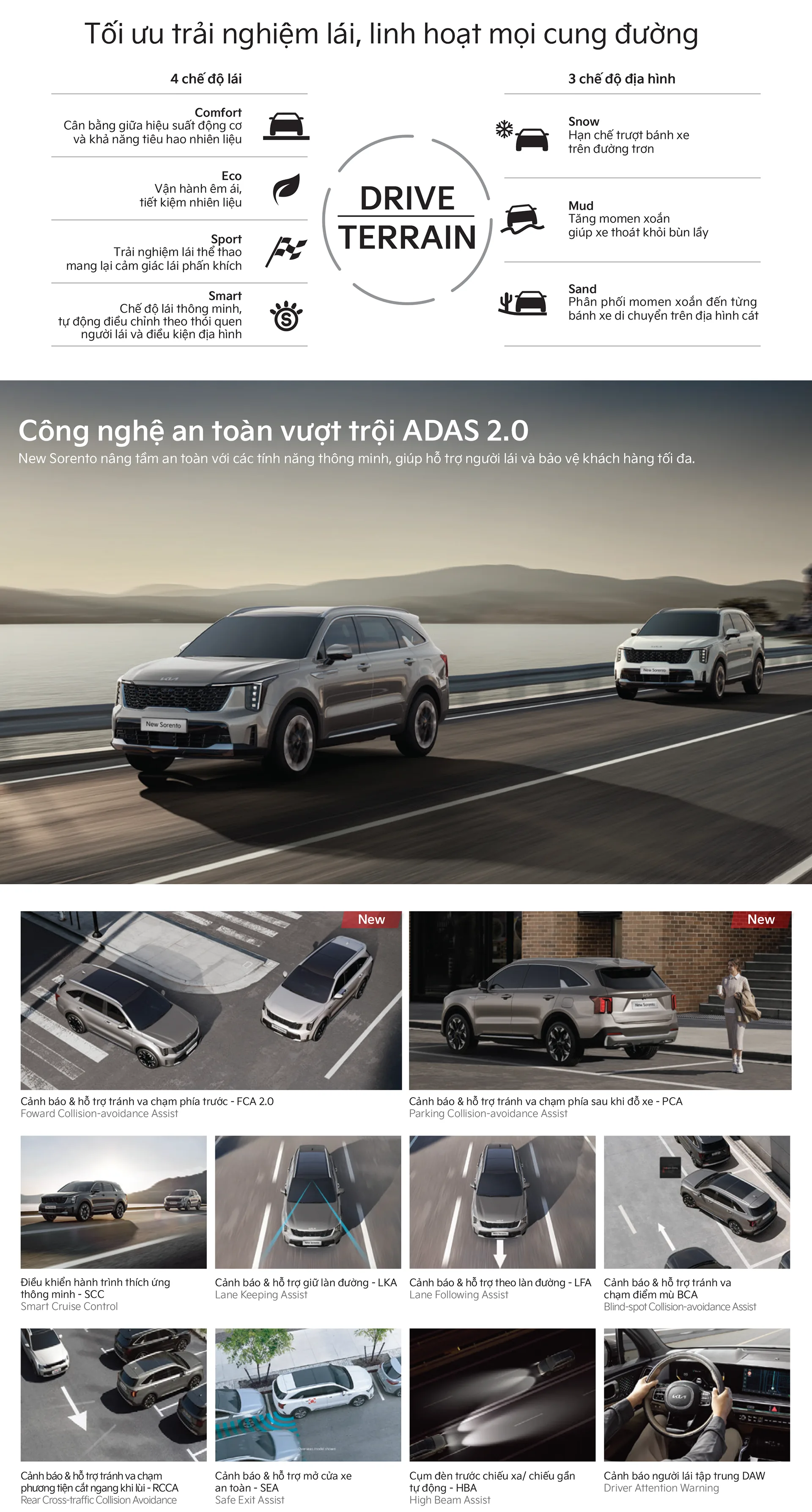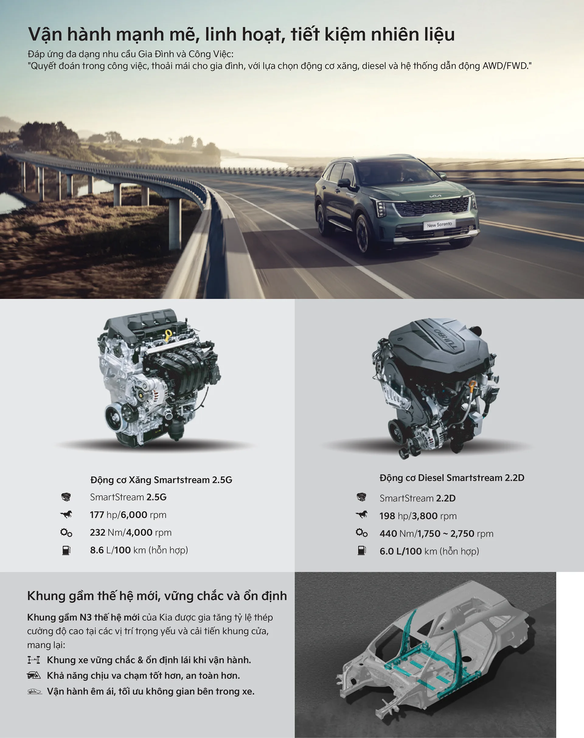 Với nền tảng khung gầm thế hệ mới vững chãi và hệ thống treo được nâng cấp, cải tiến giúp New Sorento vận hành ổn định, êm ái hơn trong các tình huống khi vào cua. Mẫu xe đáp ứng linh hoạt mọi hành trình cho công việc hay gia đình với hai tùy chọn động cơ Smartstream Xăng và Diesel, kết hợp giữa sức mạnh vận hành và khả năng tiết kiệm nhiên liệu vượt trội. Đây cũng là mẫu xe sử dụng động cơ Diesel duy nhất trong phân khúc có kết cấu khung gầm liền khối, hệ thống treo trước McPherson & treo sau liên kết đa điểm và có tùy chọn hệ dẫn động 2 cầu toàn thời gian (AWD) giúp mang lại cảm giác lái êm ái trên các cung đường đô thị, ổn định khi vào cua và xử lý linh hoạt ở tốc độ cao, đồng thời vẫn đảm bảo khả năng vượt địa hình hiệu quả và tiết kiệm nhiên liệu. Bên cạnh đó với 4 chế độ lái Normal/Eco/Sport/Smart và 3 chế độ địa hình Snow/Sand/Mud giúp người dùng có trải nghiệm lái linh hoạt, cảm giác lái tốt trên nhiều loại địa hình.